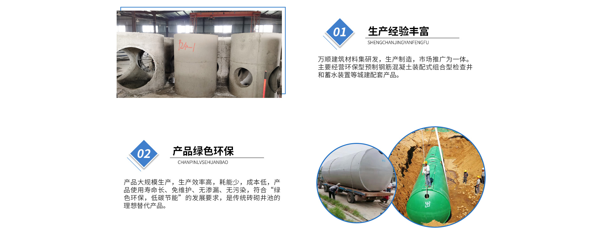 黃山市萬(wàn)順建筑科技有限公司是集研發(fā),生產(chǎn)制造,市場(chǎng)推廣為一體的綜合性企業(yè)。公司主要經(jīng)營(yíng)環(huán)保型預(yù)制鋼筋混凝土裝配式組合型檢查井和蓄水裝置等城建配套產(chǎn)品。產(chǎn)品生產(chǎn)過程采用獨(dú)特的生產(chǎn)工藝,機(jī)械化流水作業(yè)。產(chǎn)品大規(guī)模生產(chǎn),生產(chǎn)效率高,耗能少,成本低,產(chǎn)品使用壽命長(zhǎng)、免維護(hù)、無(wú)滲漏、無(wú)污染,符合“綠色環(huán)保,低碳節(jié)能”的發(fā)展要求,是傳統(tǒng)磚砌井池的理想替代產(chǎn)品。